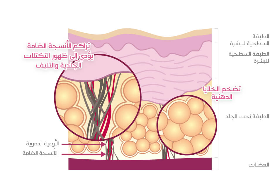في المناطق مثل الوركين والفخذين، يتسبب تراكم الدهون والإجهاد التأكسدي في ضعف الألياف الكولاجينية، مما يؤدي إلى تليف الأنسجة وبروز كتل الدهون داخل الأدمة.